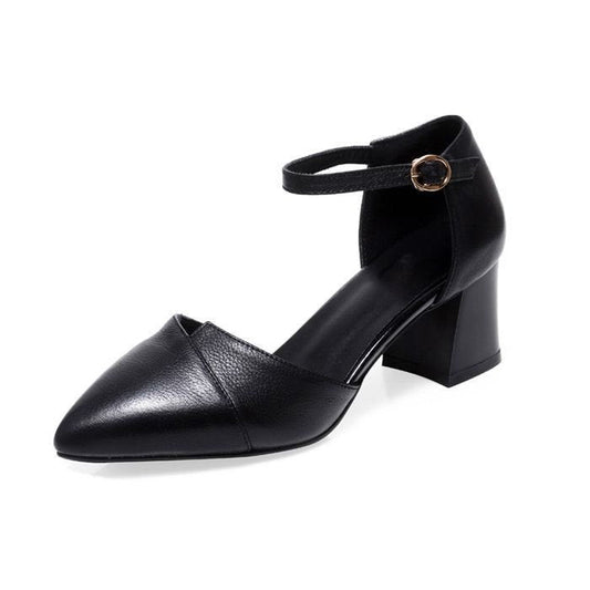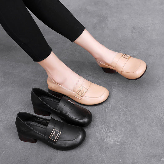 2025 nuevos zapatos de piel con tacón grueso y puntiagudo